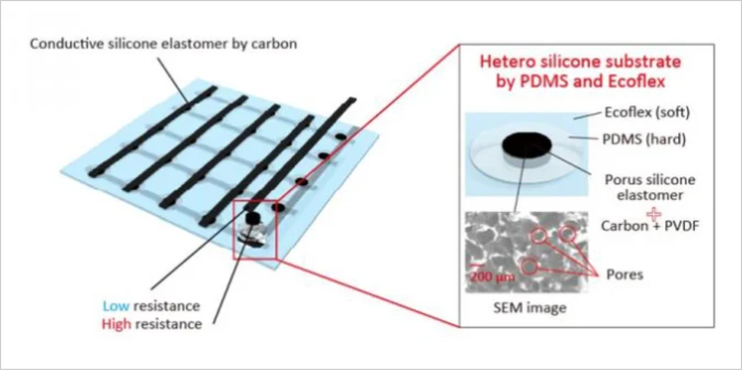 在发表的论文中,研究人员描述了使用两种不同的材料(一种软材料和一种硬材料)来保护传感器伸展和准确测量运动的能力。将硬硅树脂(PDMS)沿着阵列上的电极放置,并在每个放置的核心处放置可感测压力的柔软的多孔硅树脂。